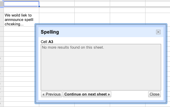 Correct spelling is an essential part of document creation and today we woild liek to annnounce that spelll chceking is now available in Google spreadsheets.